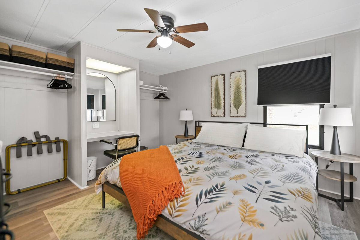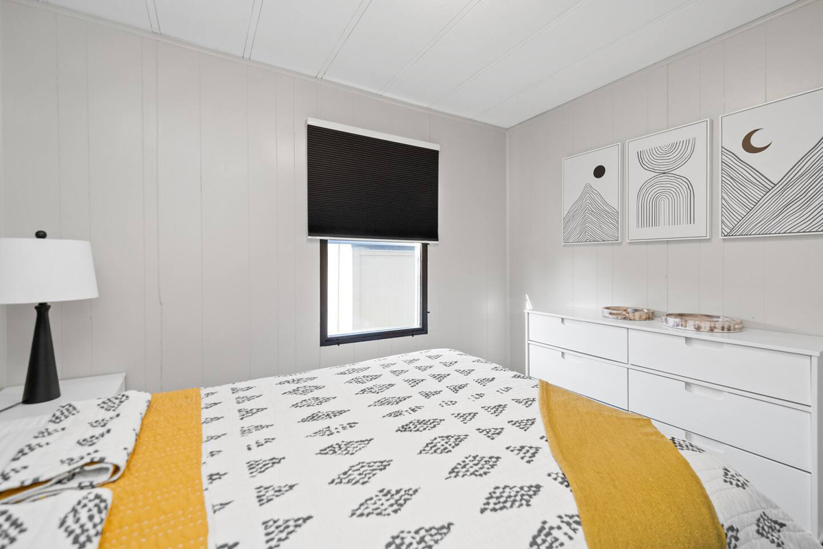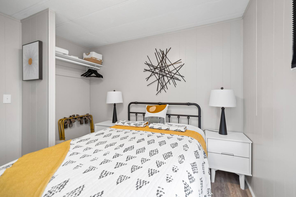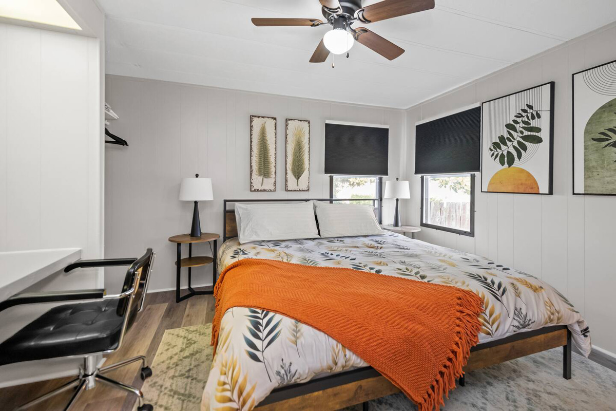 Both bedrooms include comfortable bedding and adequate storage, making the home ideal for couples, small families, or traveling professionals.